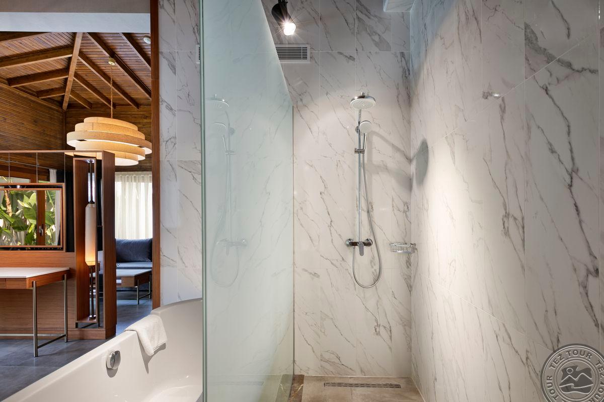 7 kahetasandilist exclusive pool villa oma basseiniga (1. tasandil: elutuba sööginurgaga, ameerika köök, teenijate tuba, vannituba dušiga, terrass; 2. tasandil: 2 magamistuba uksega, 2 vannituba: üks vanni ja dušiga, teine dušiga, 3 TV, max 6+1 in., 360 m2, VIP-teenus);